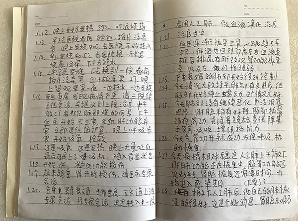 在随后的几天里,朱成凤时刻守候在ICU门外的接待室,每天和郑峰见上一面,听他介绍最新的治疗情况,她在笔记本上记录道: