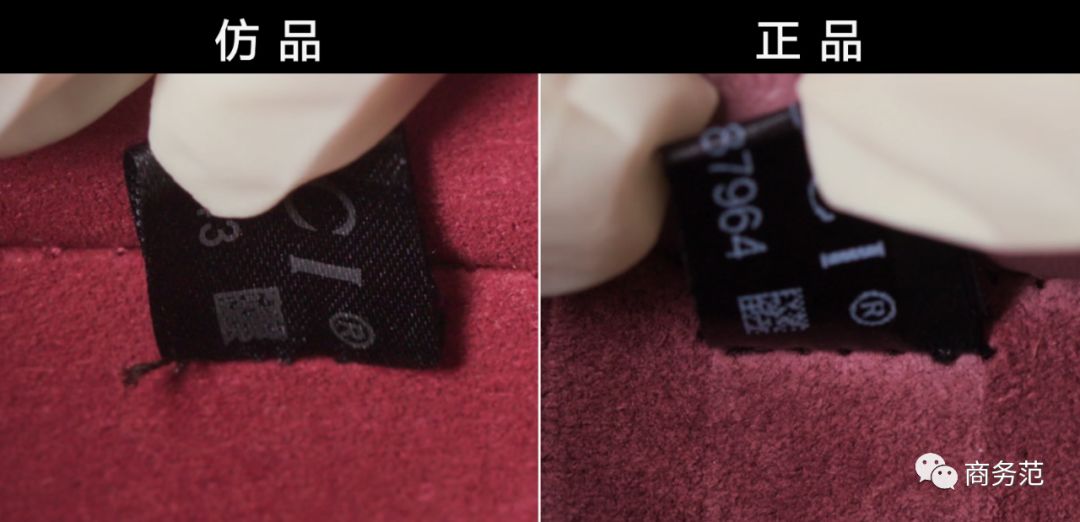 在内标下方的黑色小标,仿品缝线粗糙,印字歪斜、模糊,只在背面有半个二维码,正面没有;正品缝线整齐,印字清晰,正反面都有二维码。