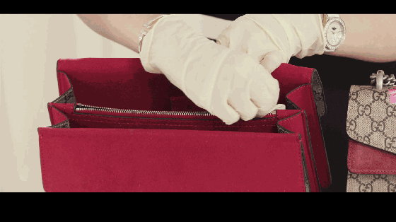 酒神包闭合处的小方搭扣,仿品的中心,帆布被打了穿孔,看到是一块红色绒布;但正品的中心,看到的是包包表面的帆布。