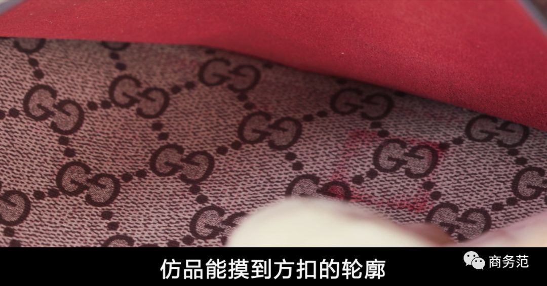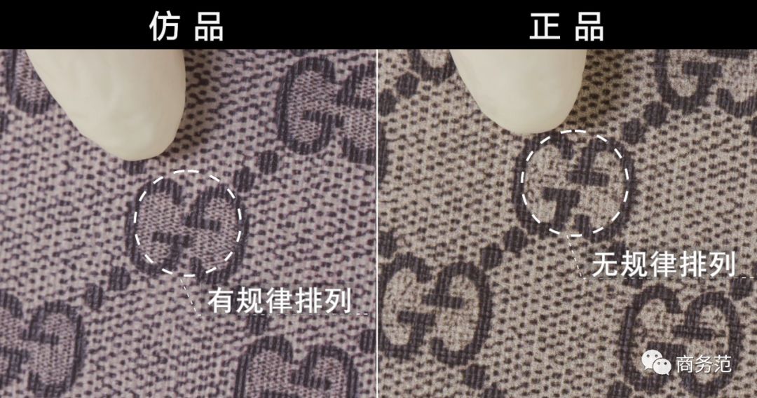 这一招非常好用,帆布上老花的双G中心,高仿的小点是有规律排序的,显得比较呆板;而正品是无规律的小点,比较自然。
