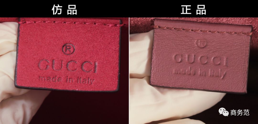 再从材质上看,正品用的是加工成绒面的牛皮,而仿品用的根本不是皮,是绒布。所以摸一下,正品的绒面会有变化,仿品就没有。
