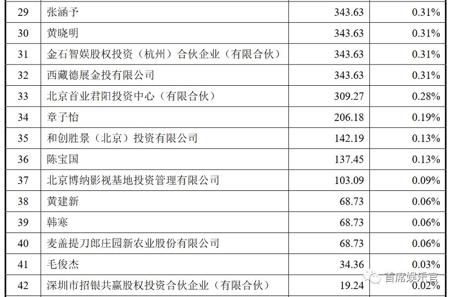 博纳影业的股东名单同样“星光熠熠”,张涵予、黄晓明、章子怡、陈宝国、韩寒和毛俊杰分别持股343.63万股、343.63万股、206.18万股、137.45万股、68.73万股和34.36万股。