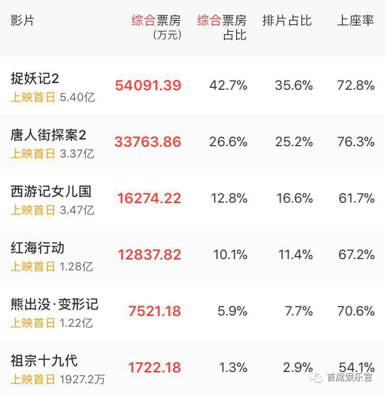 其实,在春节档的六部影片中,《红海行动》是最不符合“春节气质”的,上映首日的低排片也可见得它并不是院线预售的首选。《唐人街探案2》、《捉妖记2》、《西游记女儿国》、《熊出没变形记》和《祖宗十九代》要么是喜剧,要么是“合家欢”,要么是大IP之作,都是大家在春节期间娱乐的选择。