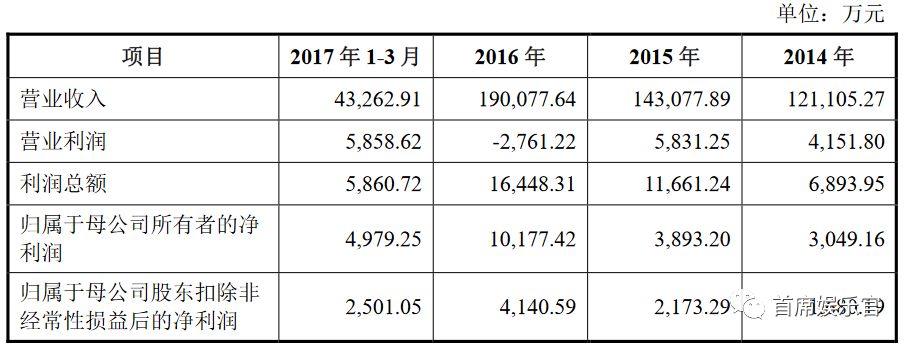 《红海行动》等一系列影片,多次证明博纳影业一路以来在口碑、质量上的过硬。不过,从财务数据看,博纳影业的营业情况却不太稳定。2014年、2015年、2016年和2017年1—3月,博纳影业营业收入分别为12.11亿元、14.31亿元、19.08亿元和4.33亿元;同期营业利润分别为4151.8万元、5831.25万元、-2761.22万元和5858.62万元;同期归属于母公司所有者的净利润分别为3049.16万元、3893.2万元、1.02亿元和4979.25万元。