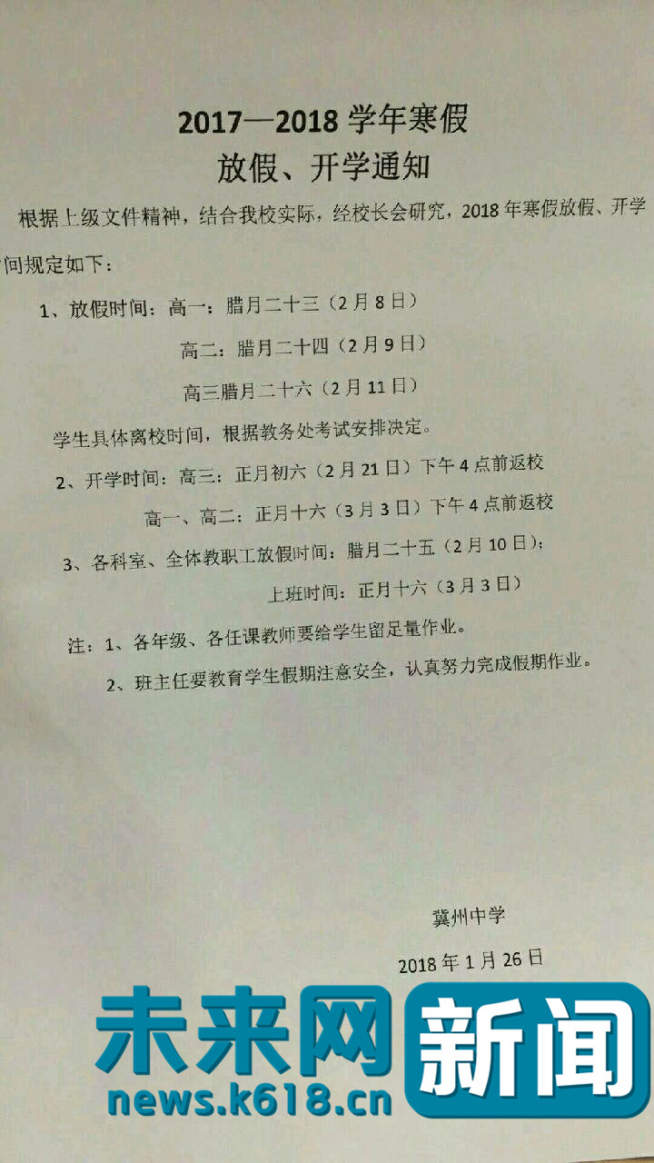 而此前,冀州中学的官方放假通知上就显示,高一、高二的学生于农历正月十六(3月3日)返校。由于冀州区隶属于河北省衡水市,记者还专门查阅了衡水市教育局关于中小学放假安排的文件。一份名为《衡水市教育局关于做好中小学、幼儿园2018年寒假工作的通知》中提到:普通高中于正月十六(3月3日)正式开学。