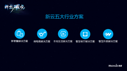 除了通用方案,微盟还有行业方案,也就是刚才提到的行业必须要深度垂直,所以微盟对每一个行业从它的中台、后台会做得非常深,目前微盟有五大行业解决方案:新零售解决方案、微电商解决方案、本地生活解决方案、智慧餐厅解决方案、智慧外卖解决方案,可以解决行业90%以上的需求,未来也可以基于微盟云做定制。