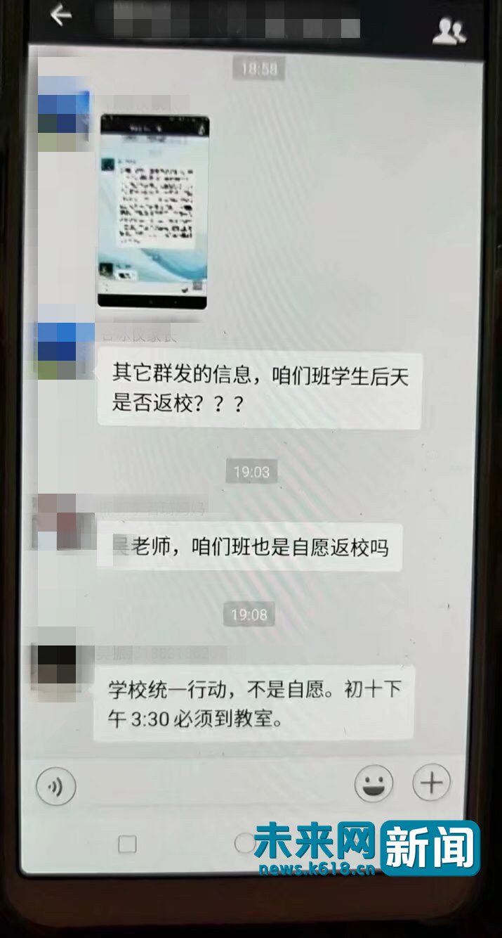 但是让王明倍感惊讶的是,尽管学校在通知中说是自愿到校,但是实际上学校却打着自己的算盘,“说自愿去学校,但应付完舆论后晚上又改口,说第二次发的不算数,学生初十必须全到。”