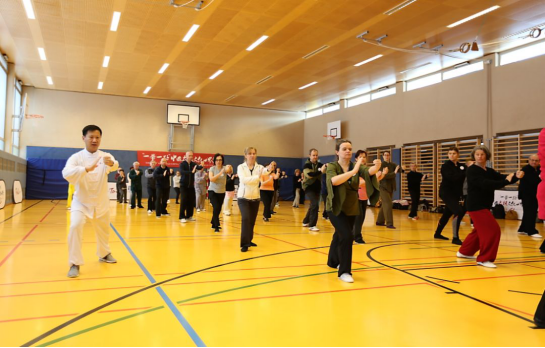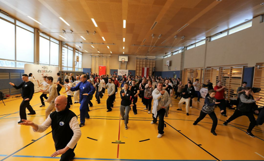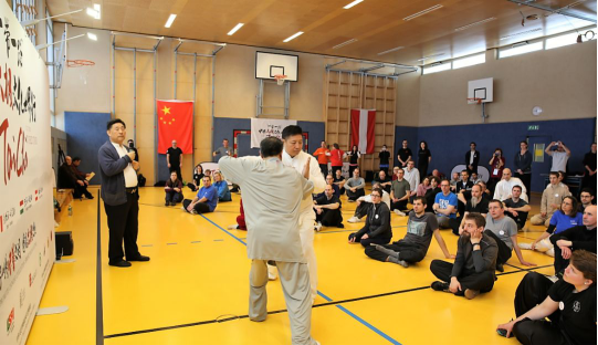 奥地利时间2月25日,“一带一路”中国太极文化世界行公益活动维也纳站圆满结束。中国驻奥地利大使馆丁雅贞参赞来到现场慰问,太极讲师团代表康戈武向丁参赞赠送礼物。此次活动吸引了来自德国,匈牙利,捷克,波兰,克罗地亚,秘鲁,意大利,以及维也纳当地共二百余位太极爱好者齐聚奥地利维也纳,考虑到人数众多,陈式及杨式的授课在两个体育馆内分别进行。