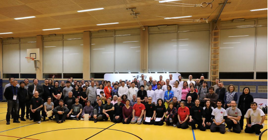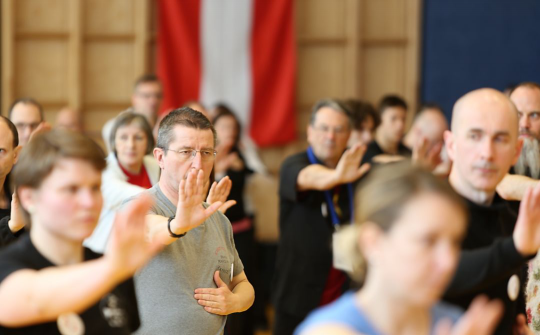 在本场活动现场见到了四个熟悉的面孔,他们是参加完柏林站课程后一路跟随太极讲师团来到奥利地的太极爱好者们。在教学的过程中,由于这四位学员在之前的课程中学习过,所以由他们分别站在队列的不同位置引导附近的学员跟上老师的教学进度。在场学员在询问为何选用段位太极拳一段单练和对打套路为教学内容时,康戈武老师解释道,通过段位制推动太极拳的标准化发展是太极拳规范化、大众化、国际化发展的基础,他要求包括新学员在内的全部学员都能完整掌握这套锻炼方法,还要求有一定基础的学员要仿效讲师授课学会教学法和组织训练方法,同时领会推广段位武术的意义。能做到学会教法、练法,领会学习段位制的深意。