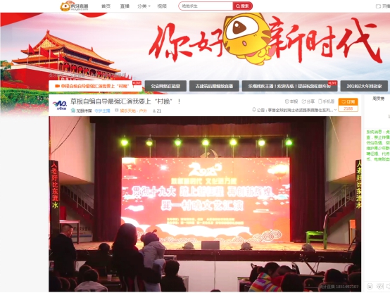 与此同时,在虎牙直播还上演了“我要看村晚”的农村春节联欢晚会。在2月9日,温州永嘉县草根农民百姓自编自导“村晚”,展现新农村气象。虎牙直播全程直播了永嘉县的这一村晚活动,也为不少观众们带来了与央视春晚不一样的收视体验。