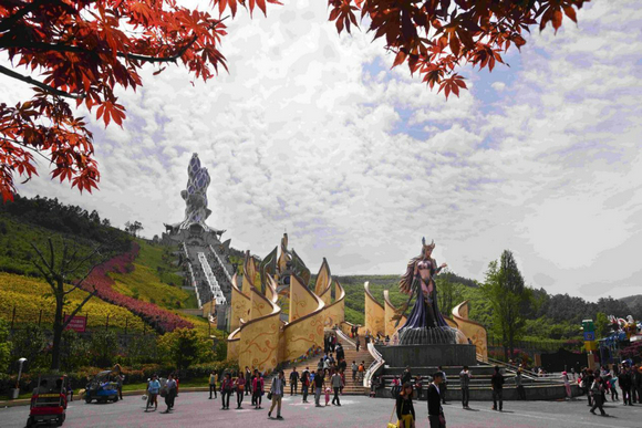 还有一个比较重要的地方就是圣殿山了,很适合拍照。那是一个很高很高的地方,需要爬上去,登山台阶两侧有八座主题雕塑,好像又是和游戏有关,因为男朋友一直在耳边乐此不疲的和我讲解。到了顶上有中华龙塔,站在上面可以看到整个嬉戏谷,拍照绝佳。
