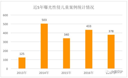 “女童保护”统计,2017年全年媒体公开报道的性侵儿童(14岁以下)案例378起,平均每天曝光1.04起。2016年这一数据为433起,平均每天曝光1.21起;2015年全年数据为340起,平均每天曝光0.95起;2014年全年数据为503起,平均每天曝光1.38起;2013年全年数据为125起,平均每天曝光0.35起。