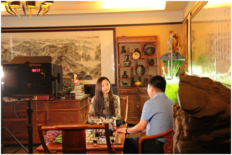 图为证券资讯频道主持人黄姿晴对山东江华能源集团董事长李高龙的采访