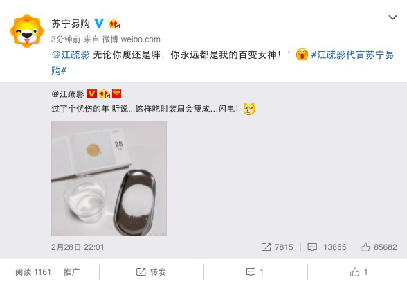 早前,江疏影曾经发微博表示自己“过了个忧伤的年。”为在巴黎时装周保持好身材,不惜只吃盐和水,着实可怜,更因此上了热搜。这也难怪一向以体贴男友自居的苏宁易购会不惜成本,跨国献礼。