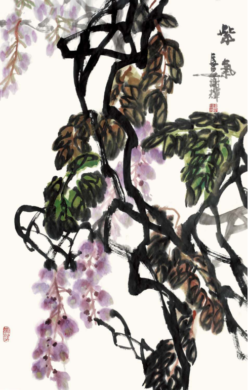 谢辉先生的花鸟画作,色彩浓艳,紫藤花轻盈袅娜,仿佛在风中摇曳,意趣盎然。枝干以浓墨写出,厚重之中流露出一种苍劲与沉着。画家深入生活,在生活中发现美,用自己的笔墨抒发对自然的热爱,整个画作和谐自然,温润雅致。