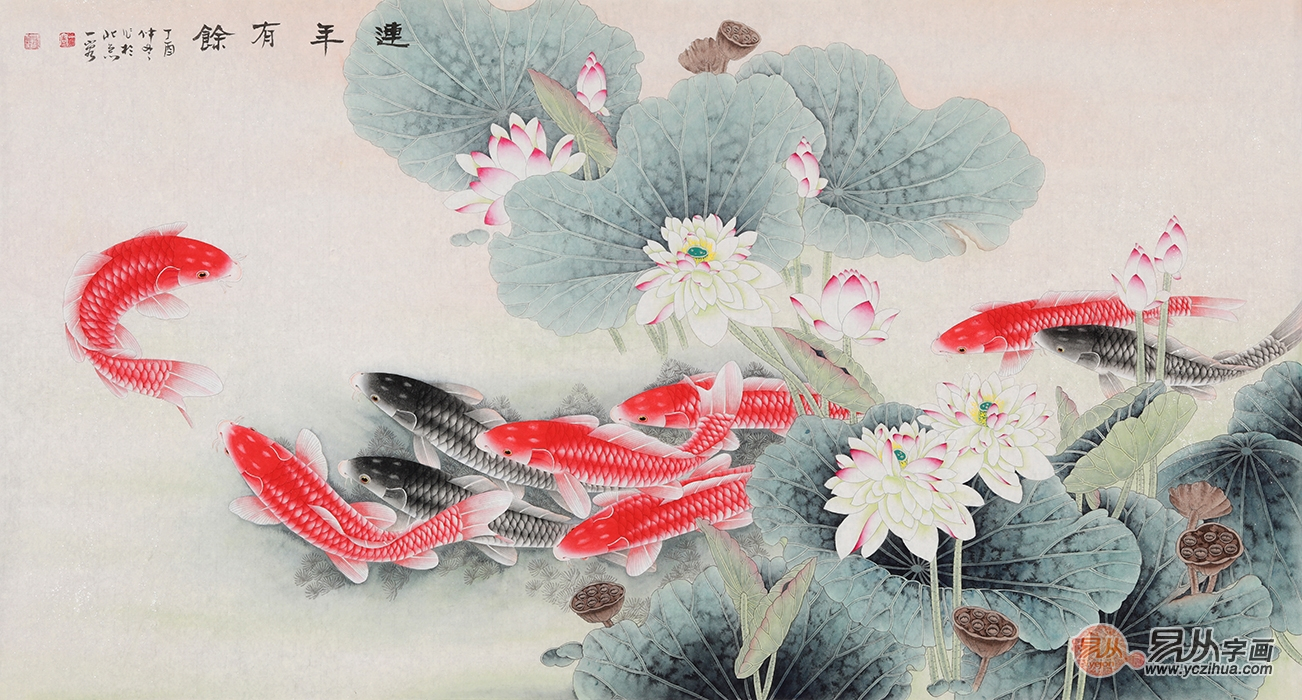 国画九鱼图 王一容新品荷花鲤鱼《连年有余》作品出自:易从网