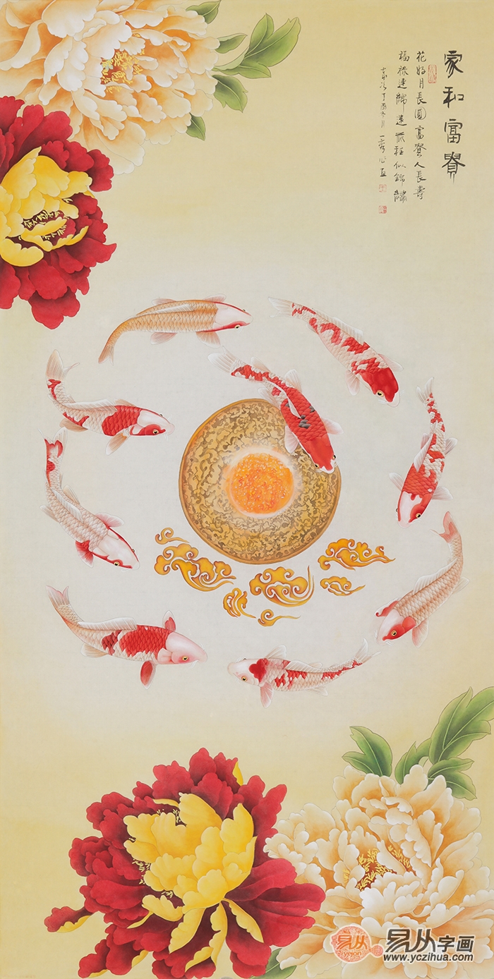 国画牡丹九鱼图:自古“九”就有长久之意。“鱼”则为万事如意。九条可爱的锦鲤在水中嬉闹,寓意着长久的吉祥如意。国画牡丹与红色鲤鱼这两种吉祥图案结合,预示着“花开富贵,年年有余”。另外,王一容老师这幅作品上的题字"画好月长园 富贵人长寿 福禄连绵远 前程似锦绣”,是特别充满诗意的表达。落款为“家和富贵”四字,更是代表着作者对美好幸福生活的希冀。