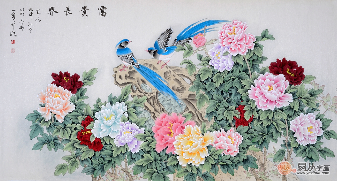 经典牡丹构图 王一容花鸟画牡丹绶带鸟《富贵长春》作品出自:易从网