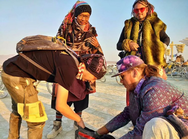 P:一方面多数人第一次去火人节的时候,都是游客身份,而不是参与者的身份。你可以认为火人节本身就是需要非常好的融入和参与的一个活动。游客心态的猎奇不能收获火人节真正的东西,很多人第一次去就是在猎奇,会耽误很多时间,要花很多时间去了解这个活动到底是怎么回事,真的尝试融入的时候,火人节大半的时间已经过去了。另一方面,火人节非常多元和丰富,根本走不完,而且每年都不太一样,都有新的主题,还有成百上千不同的营地在做不同的活动。另外我觉得,当你了解这个活动之后,看到各种光怪陆离的现象,在远离现实生活的场景里,跟外界没有办法有通讯和联络,等于是被迫的跟自己会有很多对话的时间,每年有这样的一段时间是非常好的事情。
