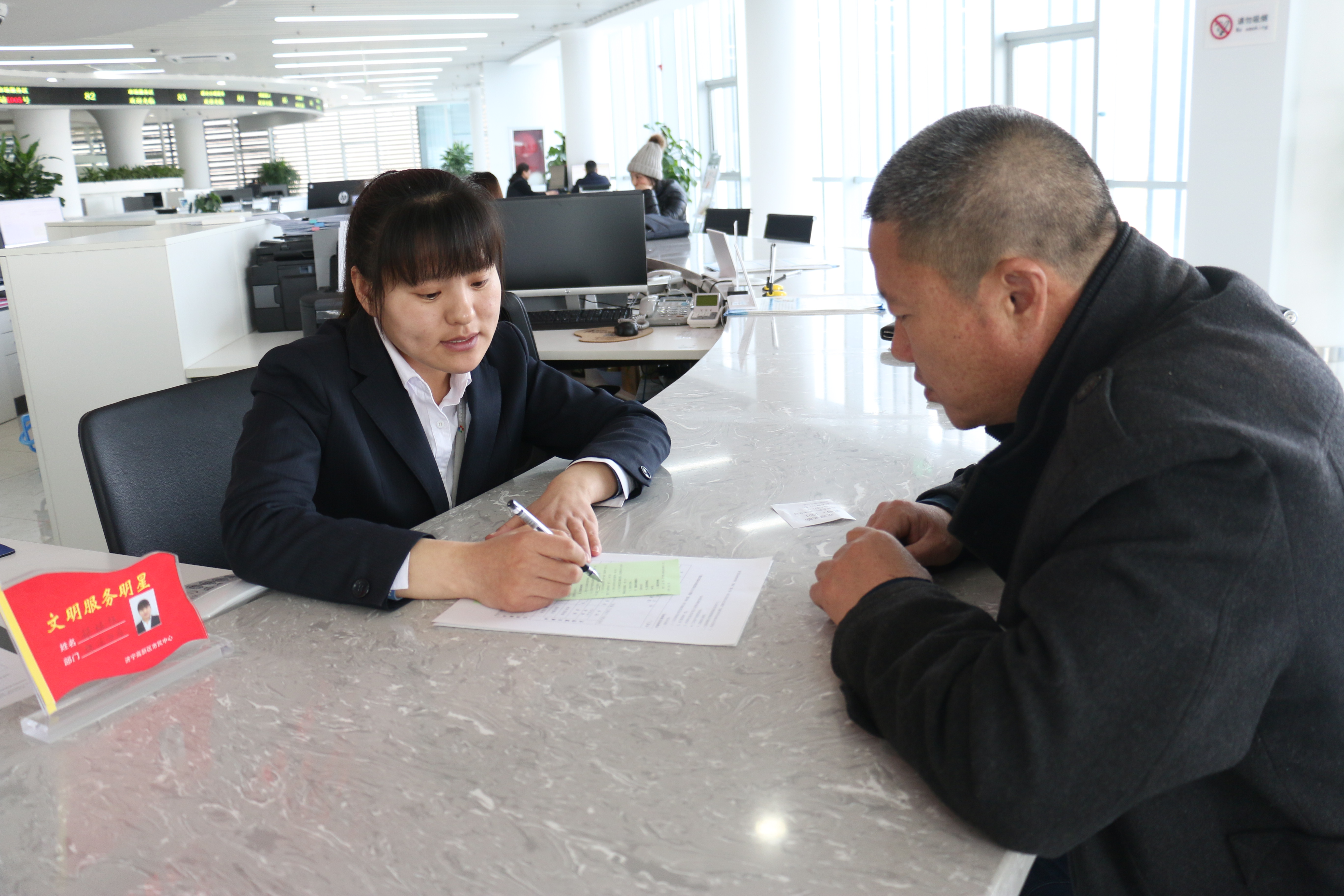 “除了原本的外观照片,您还需要提交白天和夜间门面招牌效果图各一份,设计时应与相邻店面高度一致保持市容美观……”在济宁高新区市民中心2楼65号窗口,济宁高新区综合行政执法局窗口工作人员郝林林正在与前来咨询门面招牌装修的市民进行审批业务解答。