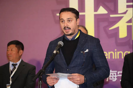 国际参展商代表在2018海宁中国国际皮革毛皮原辅料展暨海宁中国时装面料展开幕式上发言。