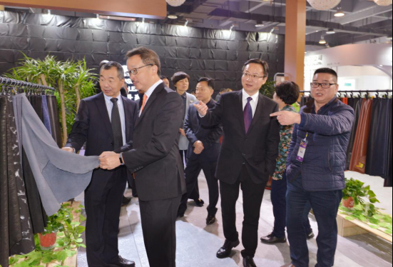 国际毛皮业协会董事及监事会主席王象志(左2)在海宁市人大主任姚敏忠(左1)、海宁皮革城董事长张月明(右2)等陪同下参观2018海宁中国国际皮革毛皮原辅料展暨海宁中国时装面料展。