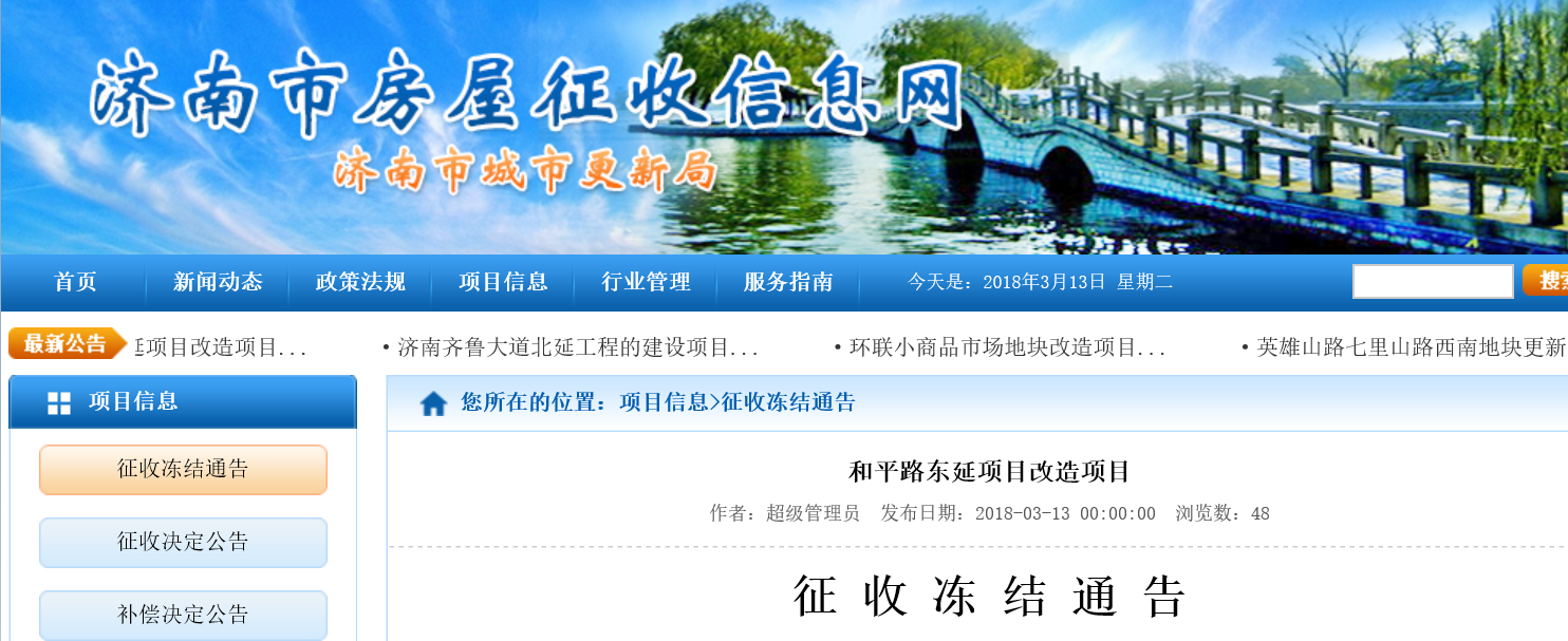 3月13日,济南市历下区住房和城市建设局发布征收冻结通告,《通告》称,和平路东延项目改造项目房屋征收范围已经确定。根据《济南市国有土地上房屋征收与补偿办法》第十一条、第十二条等规定,现将冻结事项通告如下: