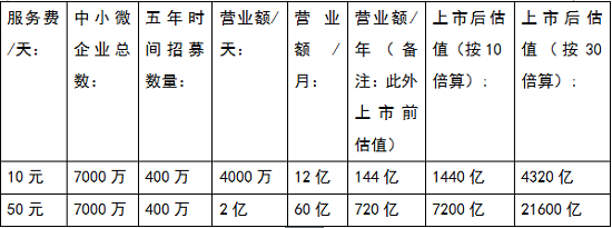 每家企业每天服务费按10元算的话,一天即为4000万,一个月即为12亿,一年即为144亿;上市后估值按10倍计算则为1440亿,上市后估值按30倍计算则为4320亿;若每家企业每天服务费按50元算的话,一天即为2亿,一个月即为60亿,一年即为720亿;上市后估值按10倍计算则为7200亿,上市后估值按30倍计算则为21600亿。