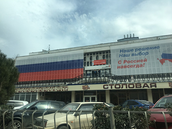 四年前由塞瓦斯托波尔发起的大量亲俄示威从而引发克里米亚入俄的印记,时至今日仍能在城市中找到:处处悬挂着俄罗斯国旗和“我们在一起”的标语,以及大幅的普京海报。