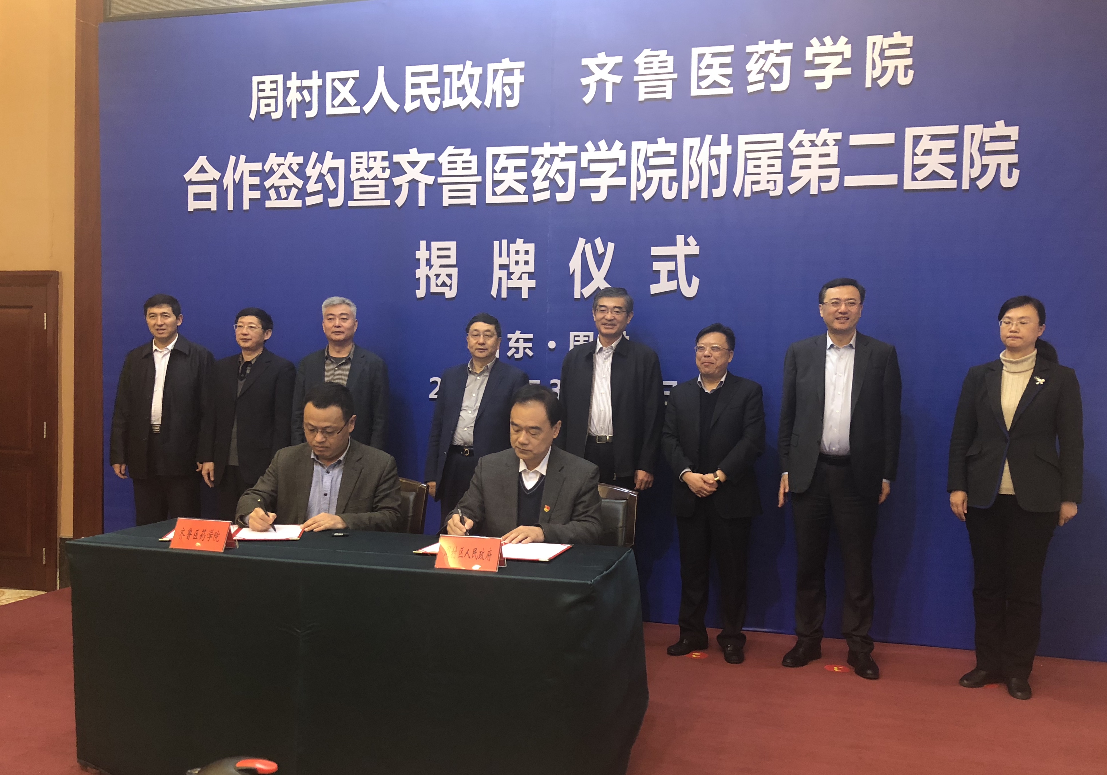在签约仪式上,淄博市副市长盖卫星与省商业集团公司党委副书记、总经理凌沛学为齐鲁医药学院附属第二医院揭牌,周村区委副书记、区长刘伟与省商业集团公司党委副书记、齐鲁医药学院董事长刘守亮进行了签约。