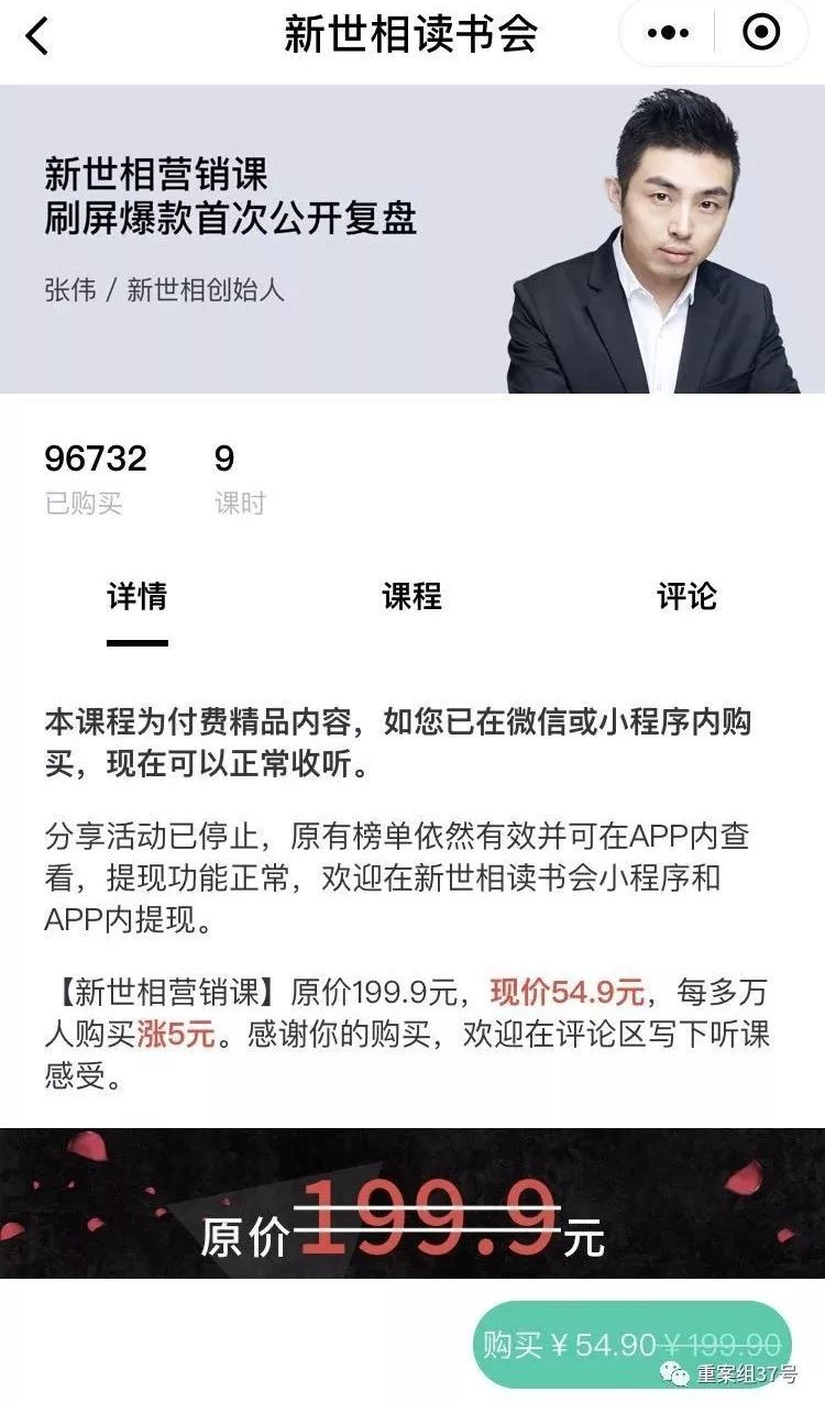 原标题:“拉人头”赚佣金 “新世相营销课”被微信封了 每万人购买涨价5元、推荐身边人购买可获得佣金、