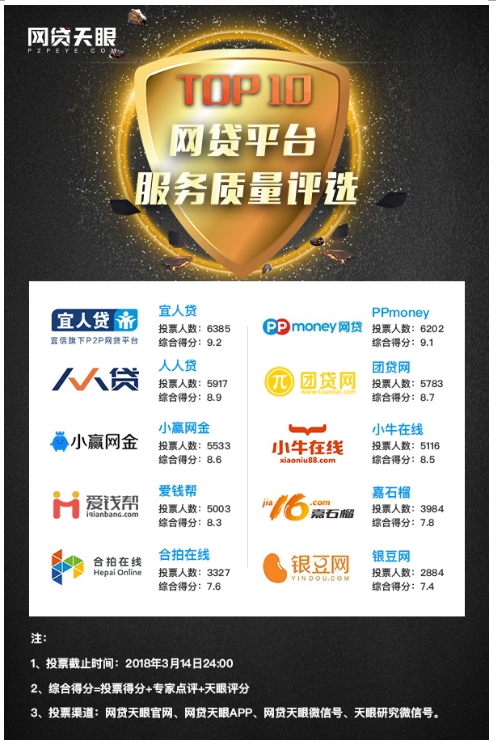 面对网贷服务质量日益重要的这一趋势,网贷天眼借3.15之际在官网、APP、微信公号、论坛等同步发起了“服务让理财更美好”主题评选活动,经过一周激烈投票,最终宜人贷、PPmoney、人人贷、团贷网、小赢网金、小牛在线、爱钱帮、嘉石榴、合拍在线、银豆网10家网贷平台入选服务质量10强榜单。