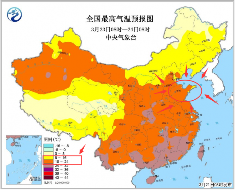 据中央气象台气温预报,本周五,山东最高气温大部在16-24℃,最低气温也在8℃左右。