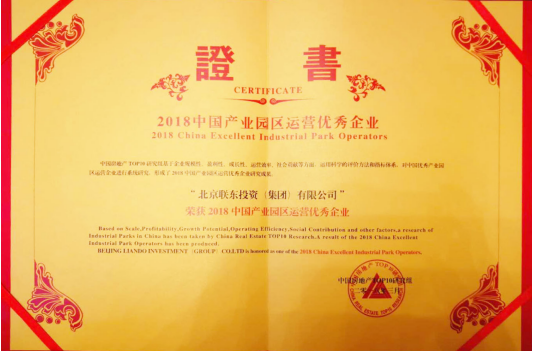 联东集团“2018中国产业园区运营优秀企业”荣誉证书
