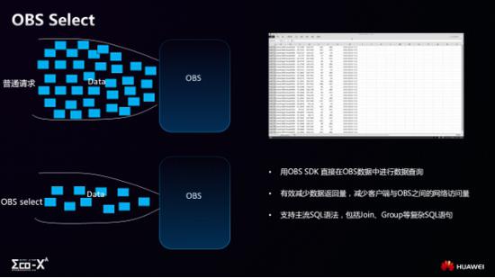 在论坛现场,华为通过视频演示了在查询违章记录场景下,使用OBS Select接口,无需导入数据库,无需数据迁移的情况下,直接对OBS桶内的数据进行SQL检索和计算,极速返回结果,OBS Select强大的功能和易用性,引起了参会嘉宾浓厚兴趣。具介绍,该功能更将会近期在华为云对象存储服务上线。