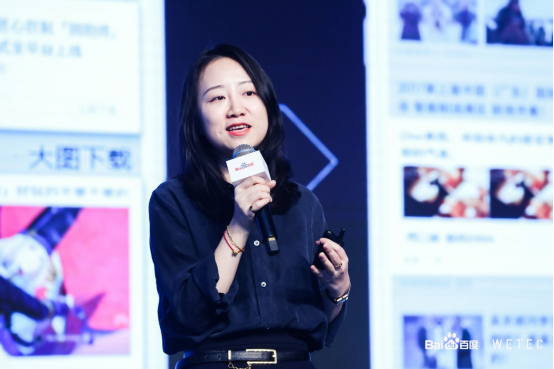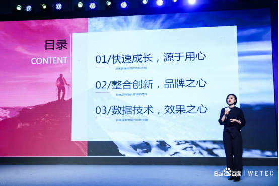 其后,致维科技华北营销总经理栾一闻女士,结合百度营销方向及致维服务优势,进行了“百度新生态,致维心营销”的主题分享。致维通过建立以数据、技术和用户为核心的精准营销体系,实现了高速发展,屡屡斩获行业营销大奖。