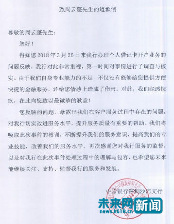 今天下午中国银行深圳沙河支行向周云蓬发道歉信。