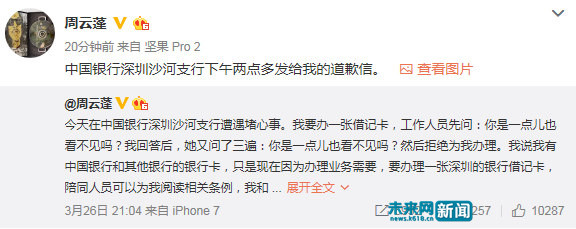 未来网(www.k618.cn 中央新闻网站)北京3月27日电(记者 和海佳) 昨晚盲人歌手周云蓬在微博发文描述其在中国银行办理经历,称银行工作人员以“无民事行为的人不能办理”理由拒绝为他办理银行卡,引起网友热议。今天下午,中国银行深圳沙河支行向周云蓬发道歉信表示,银行因专业能力不足给周云蓬带来金融服务不便,并造成情感伤害,将改进服务。