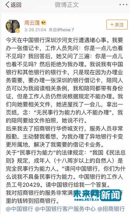 原标题:中行向盲人歌手周云蓬致歉 曾称其"无民事行为能力"拒绝办卡 未来网(www.k618.c