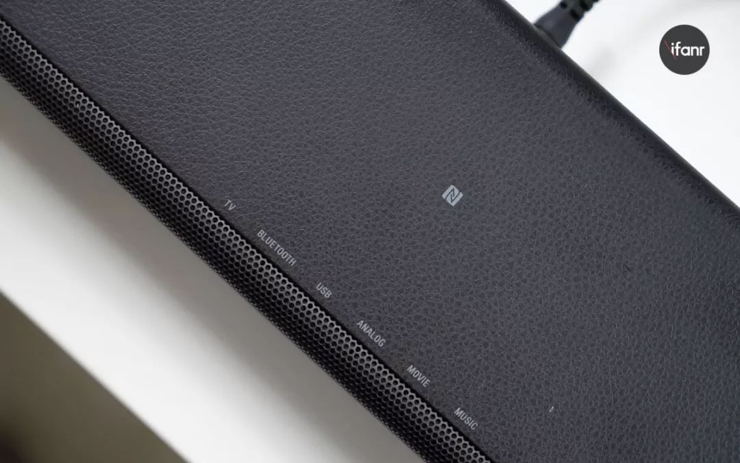 机身上层的表面有皮革包裹,NFC 触控区域、播放控制等按键都有标识,按键采用触控设计,没有专门的开口,保证了皮革表面的一体性。