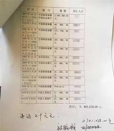 ▲王楠统计的转账金额显示2009年10月30日至2010年1月25日其共被骗270余万元。