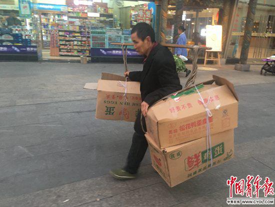 从一个个背篼和扁担挑着的纸箱里,它们被最原始的人类气力转移至餐馆、肉铺和小摊上。这种气力比箱子里的货物廉价得多,一件50斤的货物,从抬下车到上架,只值2元。背着它走上一公里、爬坎上楼,值5元。