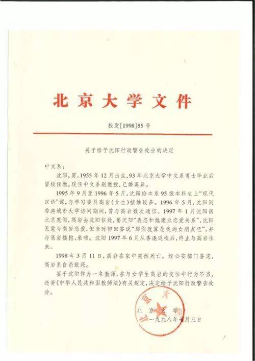 4月8日下午,北京大学公布了1998年对时任中文系副教授沈阳的处分决定。在这份文件中,北京大学认定,鉴于沈阳作为一名教师,在与女学生高岩的交往中行为不当,违背《中华人民共和国教师法》有关规定,决定给予沈阳行政警告处分。封面新闻记者注意到,该文件落款日期为1998年7月3日。该时间距高岩被发现在家中死亡已过去104天。