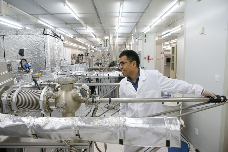 4月11日,复旦大学微电子学院教授周鹏教授在硅片上生长金属电极。