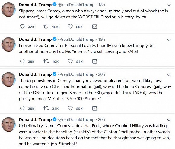 对于书中的辱骂,特朗普自然也没有保持沉默。当地时间周日早上,特朗普发了一连串Twitter痛斥这位前下属“公开机密信息”,理应被送进监狱,还说科米“不聪明”、“将被铭记为有史以来最差劲的FBI局长”。