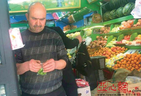 4月17日,乌市和平南路一水果店,店主玉素甫·买买提依明正将青杏装袋。阿丽米热·艾尼摄