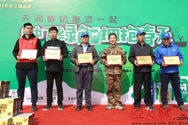 活动现场,新疆财经大学的青年志愿者们为新疆天润乳业销售有限公司、西山农牧场、亚心网、海尔新疆、新疆碧桂园房地产开发有限公司授发“新疆绿色公益联盟”首批成员单位牌匾,感谢他们为新疆的植树造林事业做出的贡献。