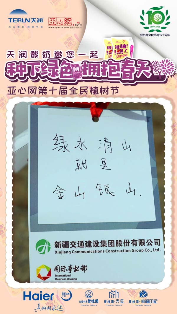 亚心网讯(记者 陈敬梅)22组的小伙伴们干起活来丝毫不马虎,新疆交通建设集团股份有限公司国际事业部的15个人栽好一棵棵树苗后,大家纷纷在自己亲手种下的树苗上挂上了许愿卡:树下的水沟都要铲得通畅,树旁的泥土都要压得结实,才配得上许下的一个个心愿,要金山银山,更要绿水青山。