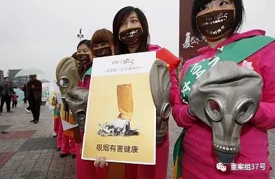 ▲2010年3月1日,杭州12位女主播头戴防毒面具,手举禁烟标识,走上街头宣传禁烟。 图/视觉中国