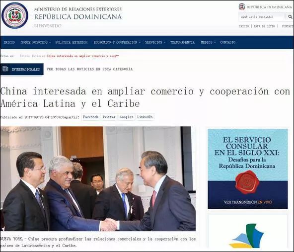 据了解,去年9月中旬联合国大会期间,台湾“友邦”多米尼加外长瓦尔加斯不但与中国外交部长王毅见面,更在该国官网上公布了二人握手的照片。